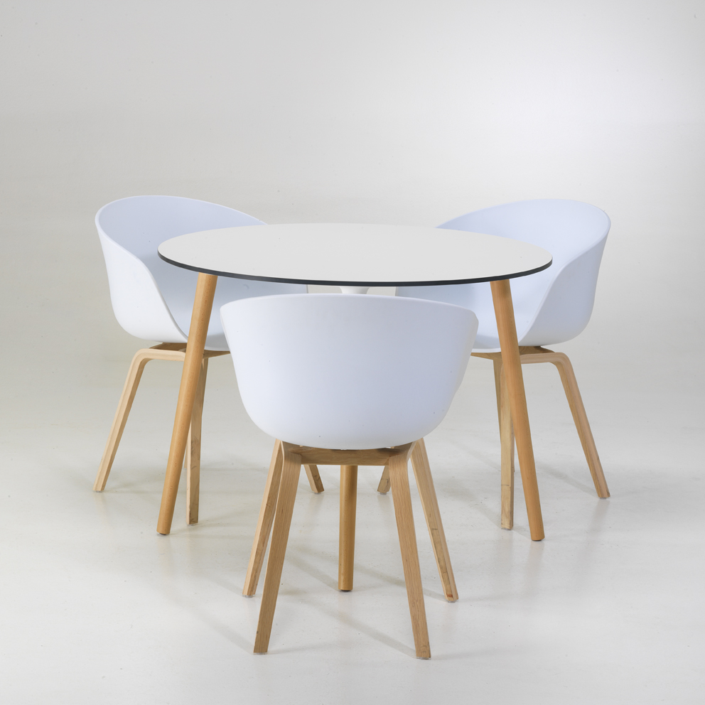 T5540 wih black edgeThe MILANO Ø100 white with Wood seating table combines modern design with natural elegance and is ideal for trade fairs and events. The white table top is supported by sturdy wooden legs, which give the table a Scandinavian look. With a diameter of 100 cm, this table offers ample space for meetings, presentations or break areas. The stylish appearance and high-quality finish make the table a versatile piece of furniture that fits perfectly into any environment.